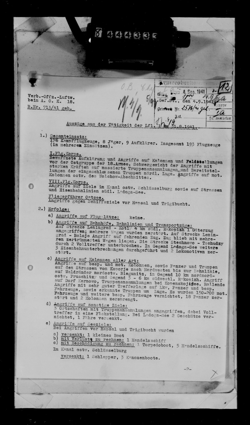 Ostfront: [...] Bei stärkerem eigenen Kampfeinsatz gegen Schiffziele im Finnenbusen werden 1 Zerst. und 2 Dpfr. in der Triigi-Bucht beschädigt, 1 kleines Fahrzeug versenkt, vor Hapsal und bei Hochland 6 weitere Dpfr. beschädigt gemeldet. [...]