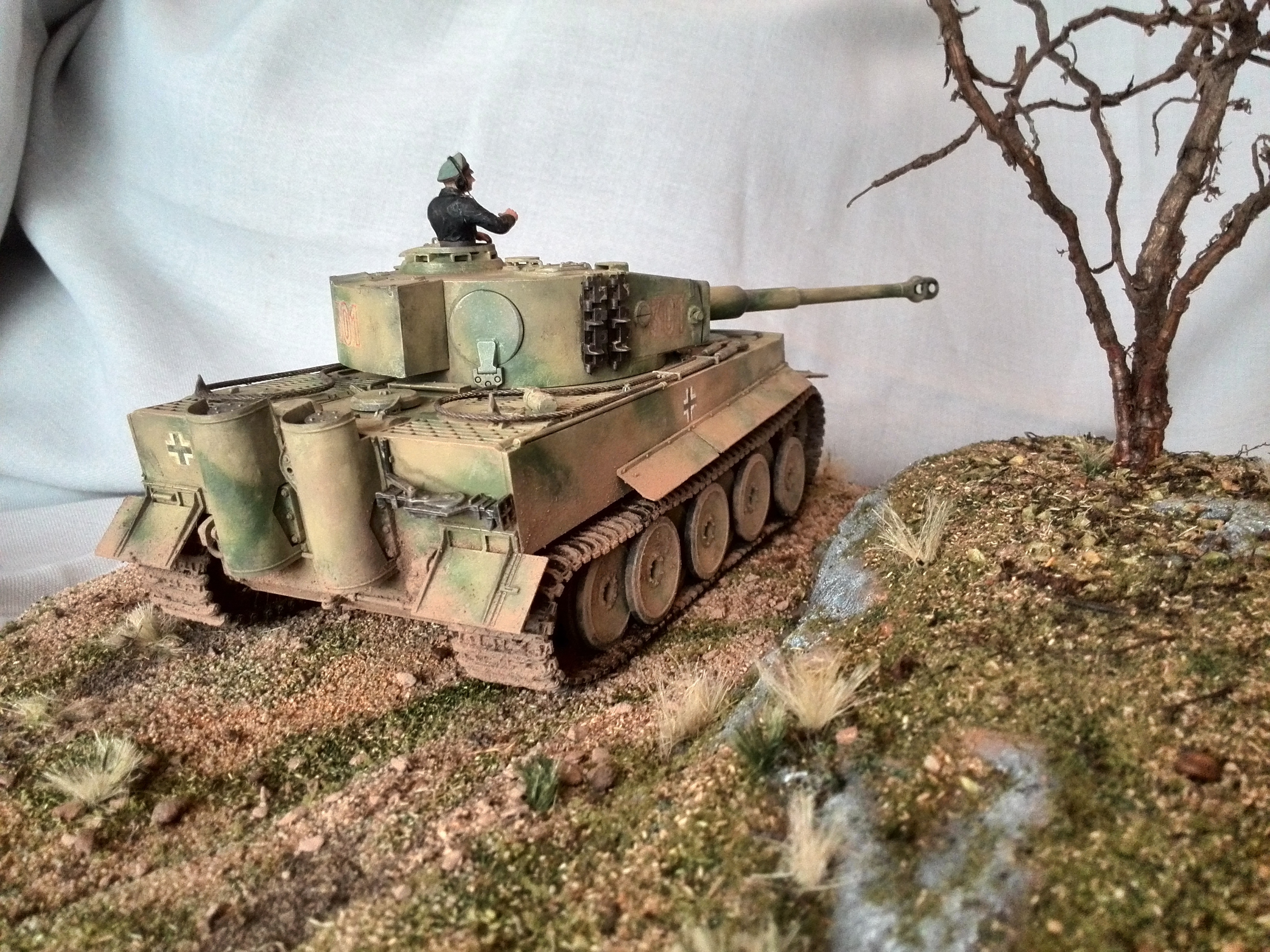 Järgmise asjana panin kokku tiigri. Ratta kinnitused liimisin külge enam vähem maastiku kumerusi arvesse võttes. Kui tank sai kokku pandud võis alata dio aluse värvimise ja maastiku kujundamisega. Kasutasin nii aluse kui tanki värvimisel Tamiya vee baasi värve mis kuivavad meeletu kiirusega (mulle meeldib). Emailidega oli alati see jama, et pidid 24h kuivada laskma ja muidugi need aurud millega tuba täitub, eriti aerograafiga värvides (emaile ei kasuta enam ilmselt kunagi). Tänu, juba mainitud Tamiya värvide headele omadustele sai tiiger kasuka selga praktiliselt ühe jutiga (baasvärv, camo, vesikad, kulumisjäljed, pesu ja muda). Üks vesipilt läks viimistlemise ajal puruks, aga peenike pintsel aitas uue märgi maalida.