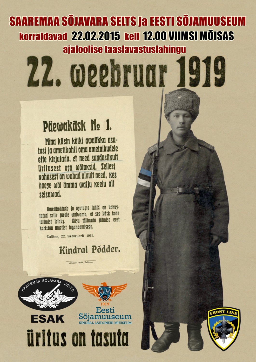 Pühapäeval 22. veebruaril algusega kell 12,00 korraldab Saaremaa Sõjavara Selts koostöös Eesti Ajaloomuuseumiga taaslavastuslahingu "22.veebruar1919".