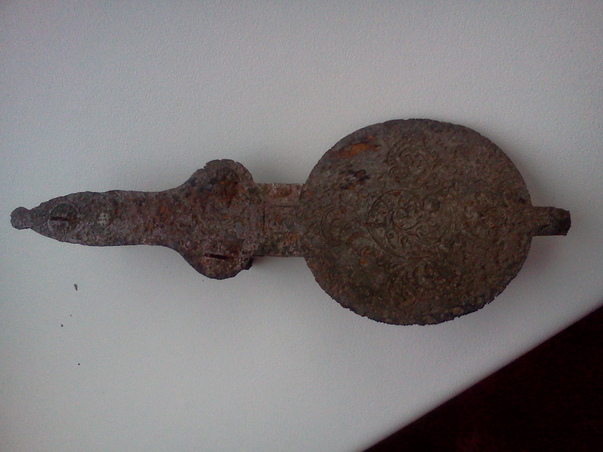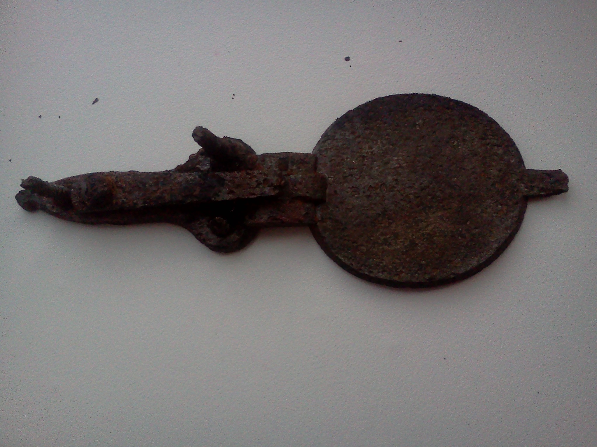 Leidsin mõni aeg tagasi huvitava vidina.Tehes nüüd el.lüüsi,tuli sellelt välja mõned numbrid. Ehk on keegi näinud sarnast vidinat? Tagaküljel on kummuli keeratud neptuni hargi moodi kujutis ja sellele järhneb mumber 409.Esiküljel vaid ilunikerdused. Eseme ümar pool on hingega avatav,mille fikseerib terasvedru,mis on tagaküljel. Jubin on olnud 3 puukruviga puust asja küljes.Kogupikkust on 135mm,klapiosa on 46mm lai.