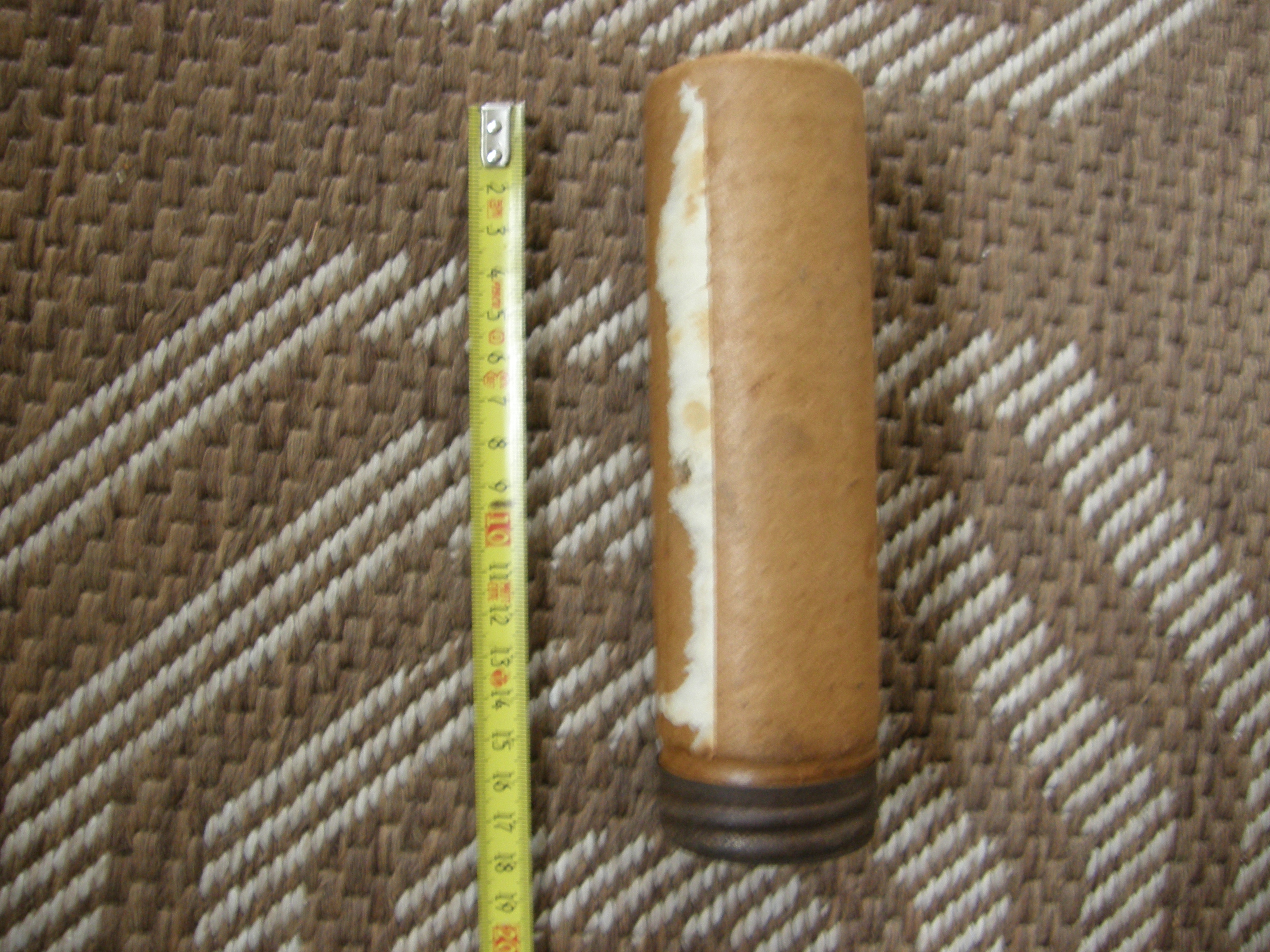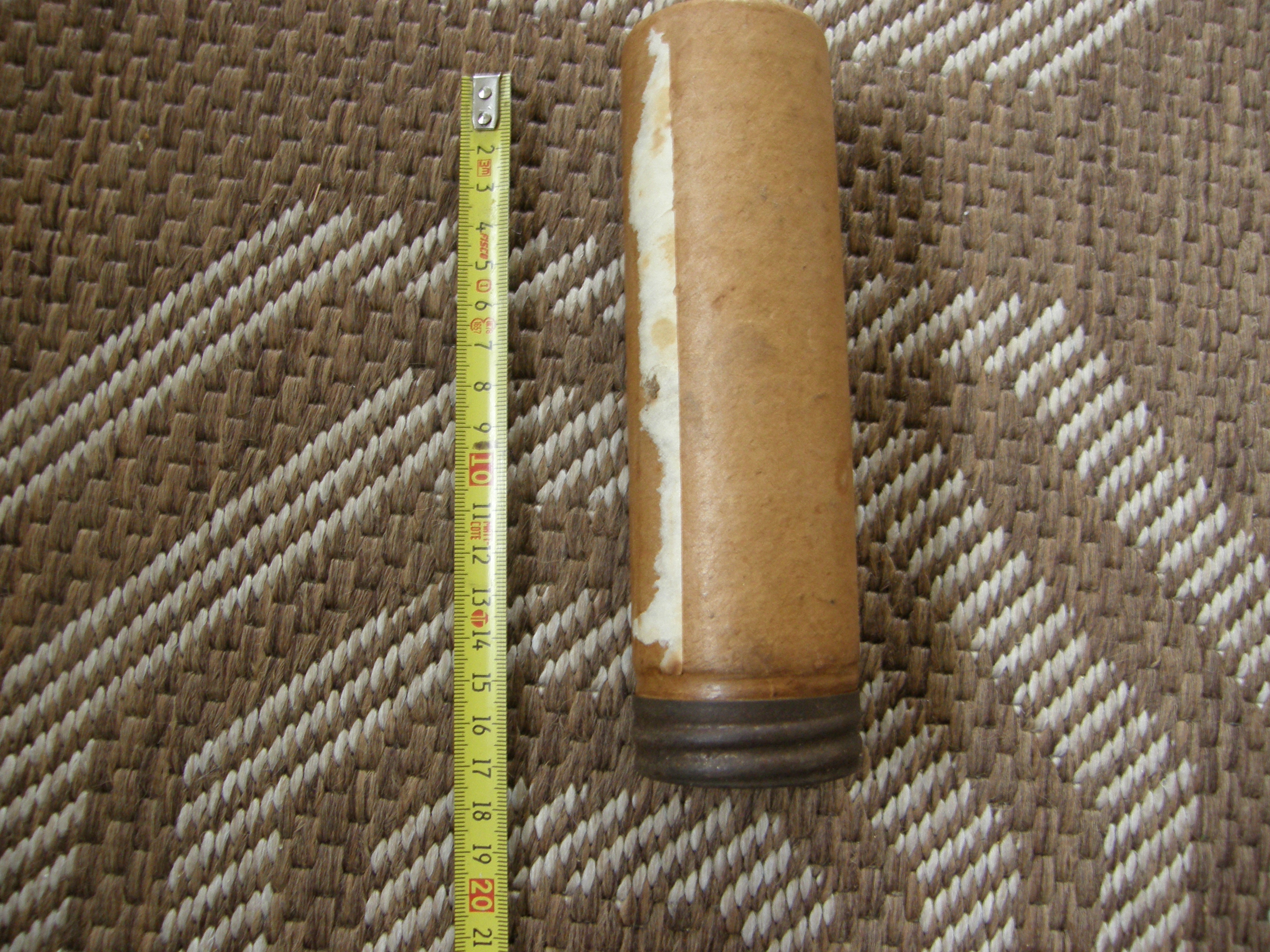 Ehk oskab keegi nõu ja jõuga aidata! Ise arvan, et pigem mitte. Meenutab küll saksa mingit "tube'i", just keeratud otsast, aga samas sellist metallkaanega ei tule ette, et oleks olemas (reeglina ikka moonal kahepoolne kartongtops ju) ja küll kuskil e-bay's on üks kuju sellise mingi saksa WW2 "smoke round'i" pakendi pähe müüki pannud, aga ei tule küll ette, mis "smoke round" sinna sobida võiks. Samas mingi Saksa tööstuse lõngade topsid, mis nähtud olid jällegi väga sarnased. Usun, et kindlasti on kellelgi sellist kätte puutunud ja täpselt sama küsimus tekkinud. Kes oskab nõuga aidata?
