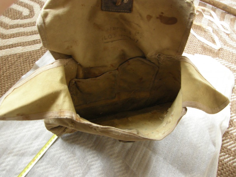 Selline huvitav presentkott siis küsimärgi all. Tunduks nagu militaarse näoga. Keegi ehk teab? Mingid rihmad on tagapool küljest lõigatud, kas tundub nagu võiks olla lõigatud ümber keha sidumiseks olnud rihm? Ehk mingi 30ndate gaasimaskikott?