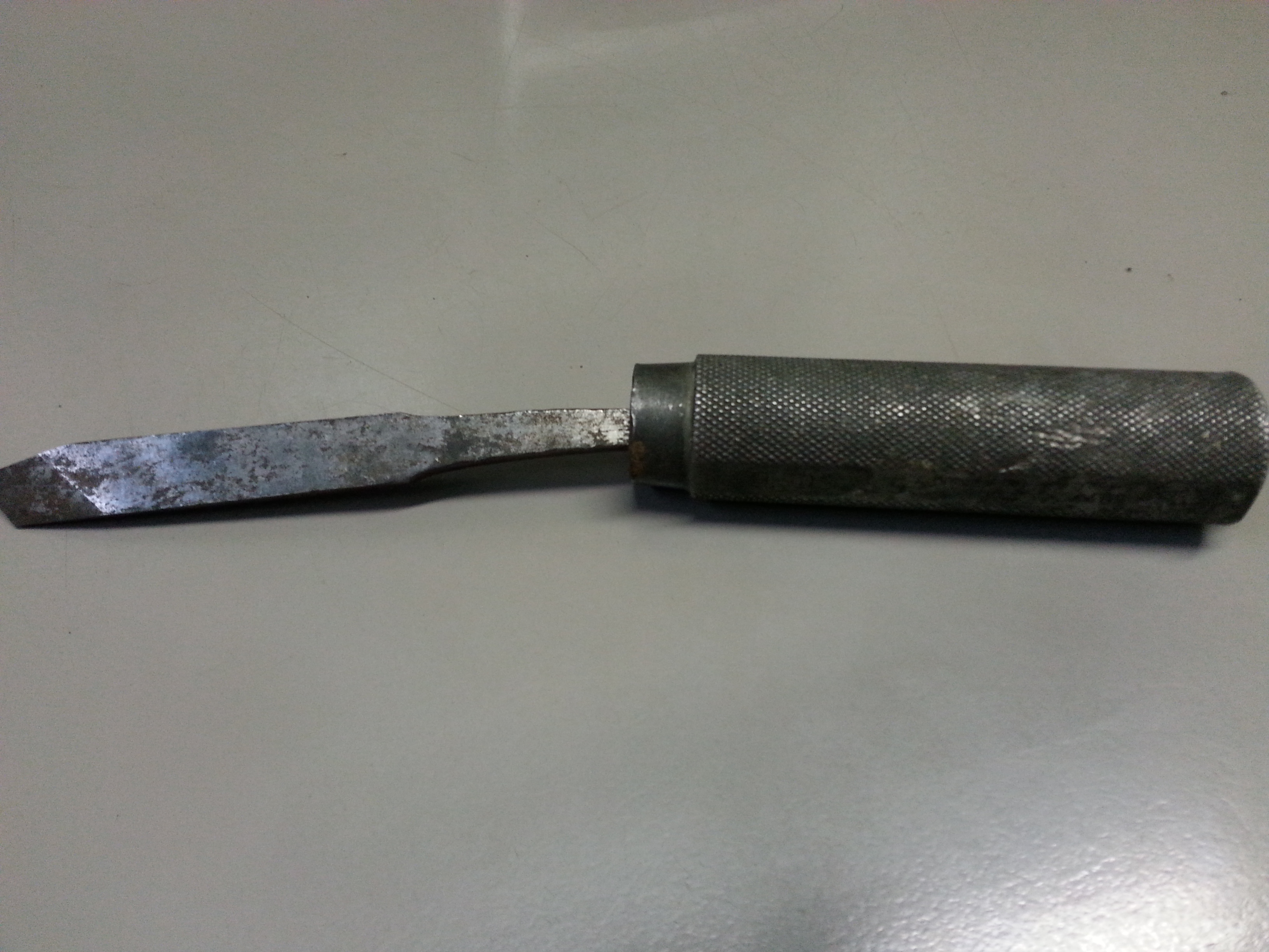 Asi praeguseks minu kätte jõudnud, käepidemele mingi puidust punn sisse löödud ja tera sinna sisse surutud. 99% tõenäosusega arvan, et noa käepideme tegemiseks on kasutatud mingilt mehhanismilt laenatud jublakat. Praeguses variandis pigem tegu vast mingi puidu graveerimisnoaga siis. Aga vaevalt, et ühegi puidunoa käepidemele nii ohtralt markeeringuid oleks peale kantud. Lootsin, et ehk needsamad markeeringud toovadki selgust. Aga Arsenalis vedelenud analoogsed rihveldatud tagaosaga jupstükid - küsiks, mis neil eesotsas oli?