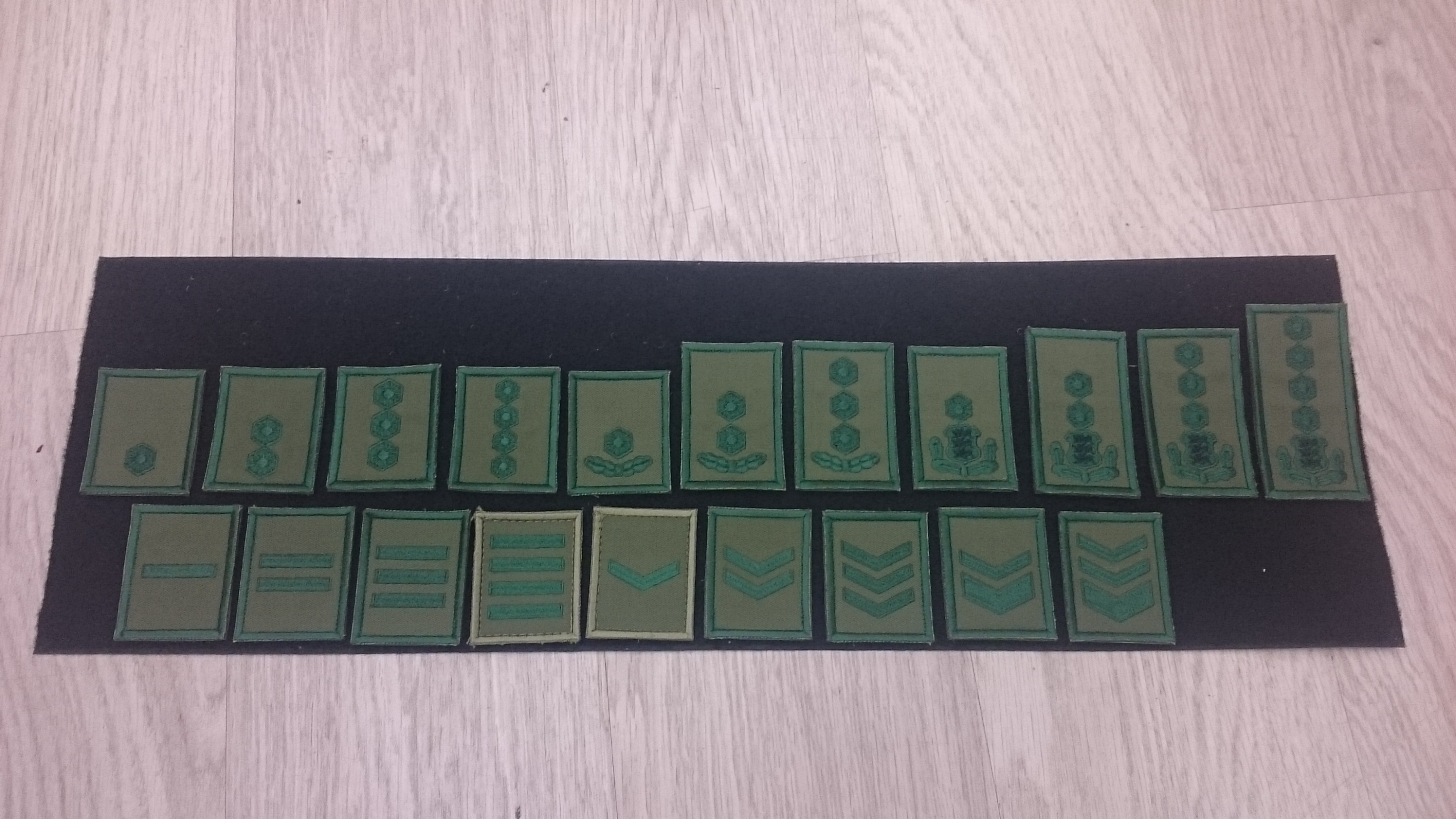 Lisan ka pildina valmis saanud täieliku "auastmetabeli". NB! paar tükki on veel eelmisest põlvkonnast, st kuldse äärega. Edasi tekitan rohelise servaga, on parem. Vanem- ja kõrgemate ohvitseride omad on tõesti hästi välja kukkunud, ei ole häbi isegi uuele KVJ-le kinkida.