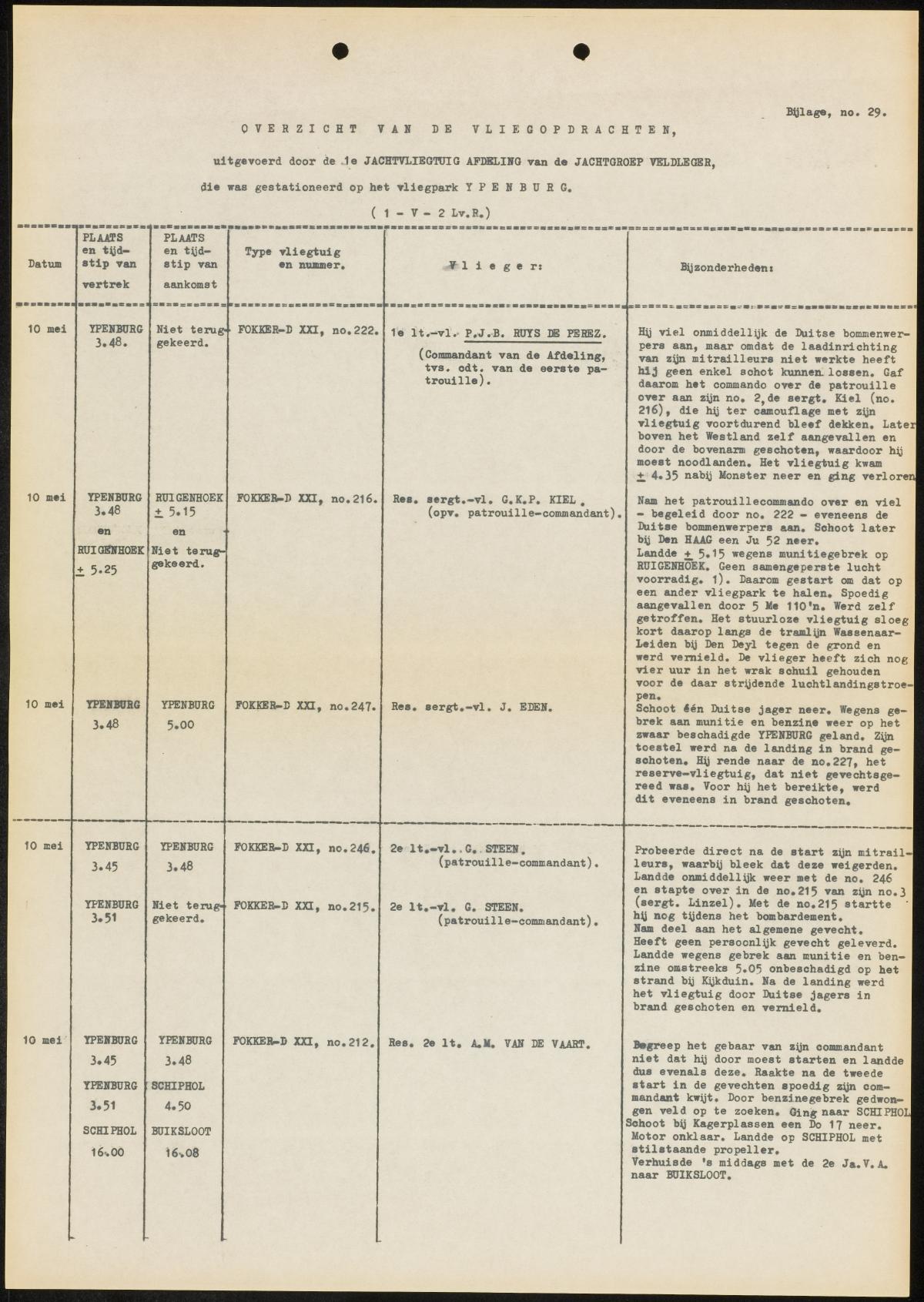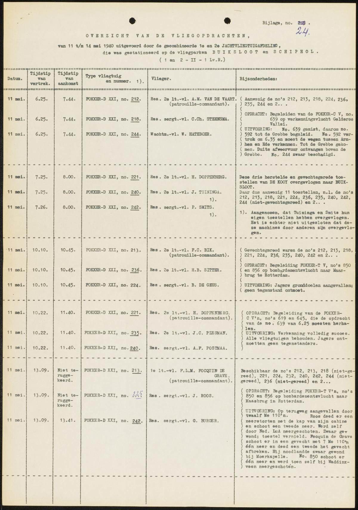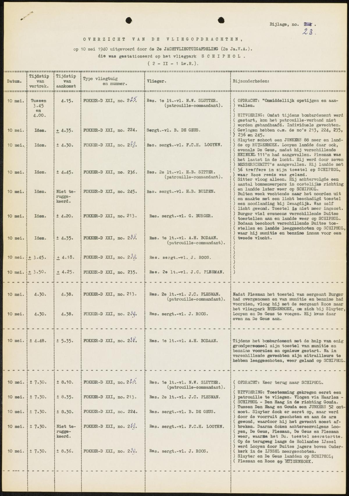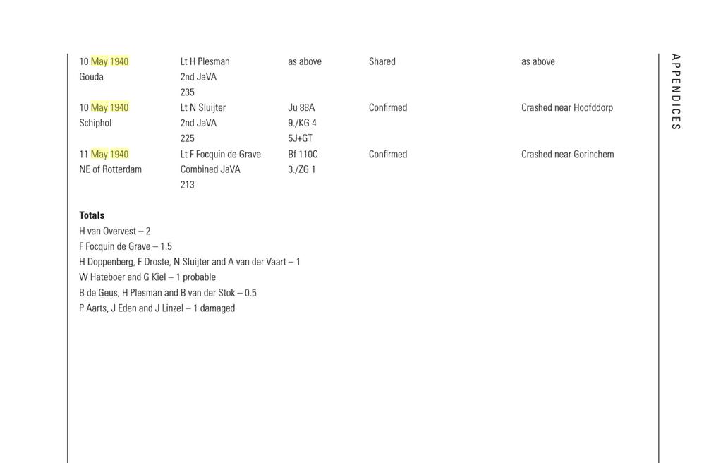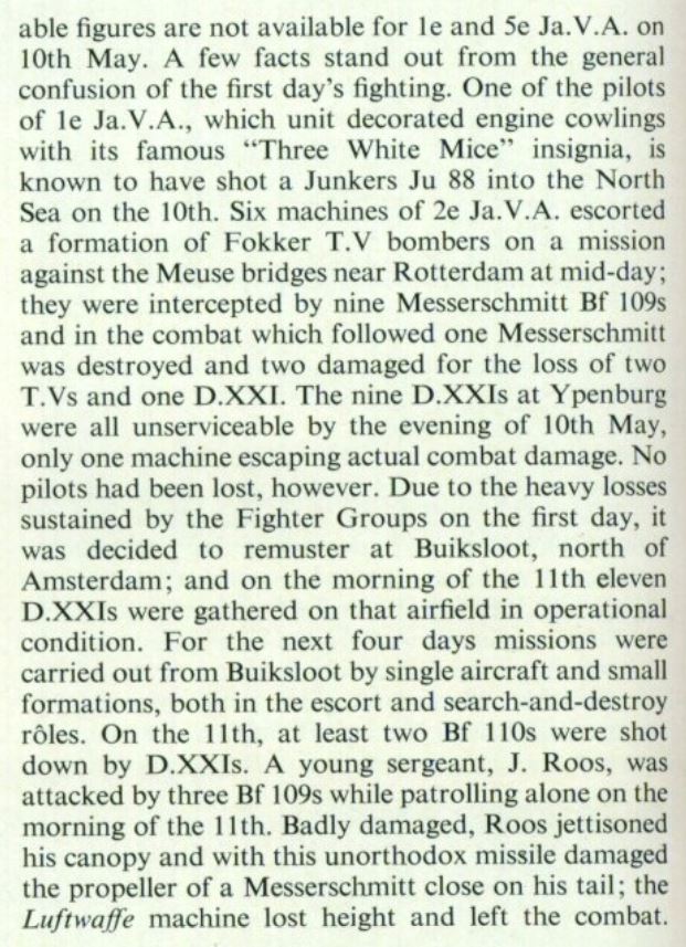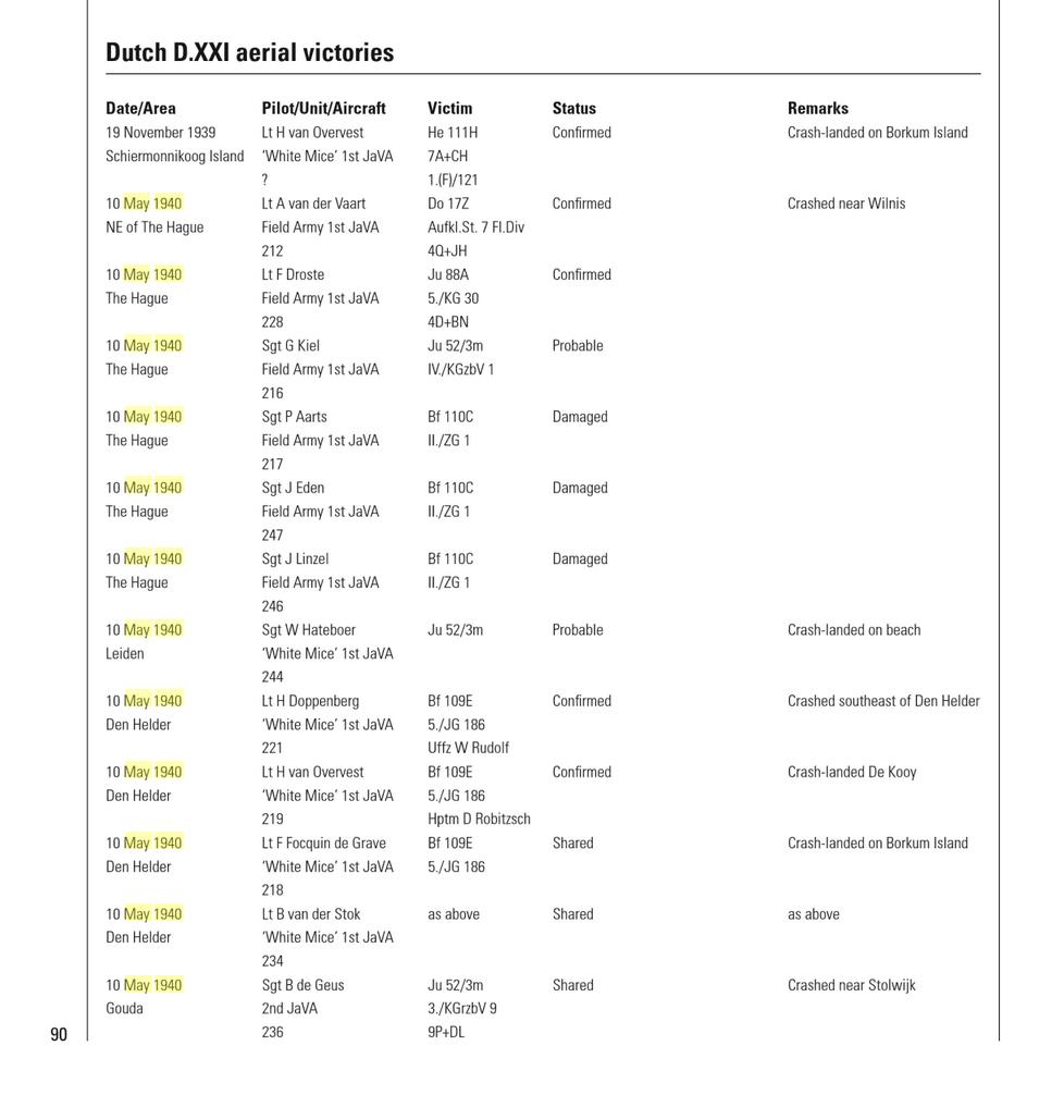 Per Dutch type the following confirmed kills: Fokker D-XXI, 16 victories [5 off Bf-110, 5 off Bf-109, 2 off Ju-88, 1 off He-111, 1 off Do-17 and 2 off Ju-52], Fokker G-1,  14 victories [5 off Bf-109's, 6 off He-111, 2 off Ju-52 and 1 off Ju-87], Fokker T-V bomber, 6 victories [1 off Bf-110, 2 off He-111, 3 off unknown type] and the Douglas 8A3N instant fighter planes, 2 off Ju-52's.