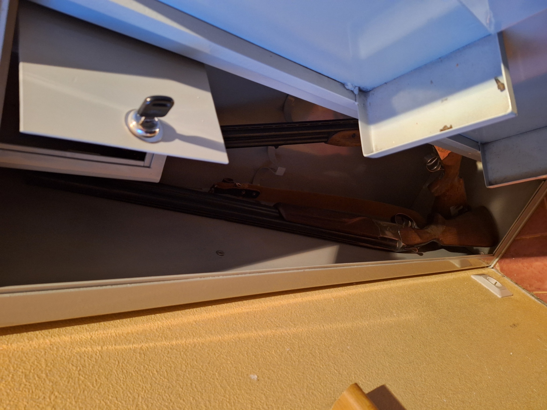 Uueväärne. S x L x K = 30cm x 35cm x 125cm. Ruumi 2'le vintrelvale ja 2'le sileraudsele. 2 lukuga ja sees eraldi lukustatav padrunisahtel. Valmistatud 3mm plekist. Pulbervärvitud. ca 50kg. Hind: 260EUR