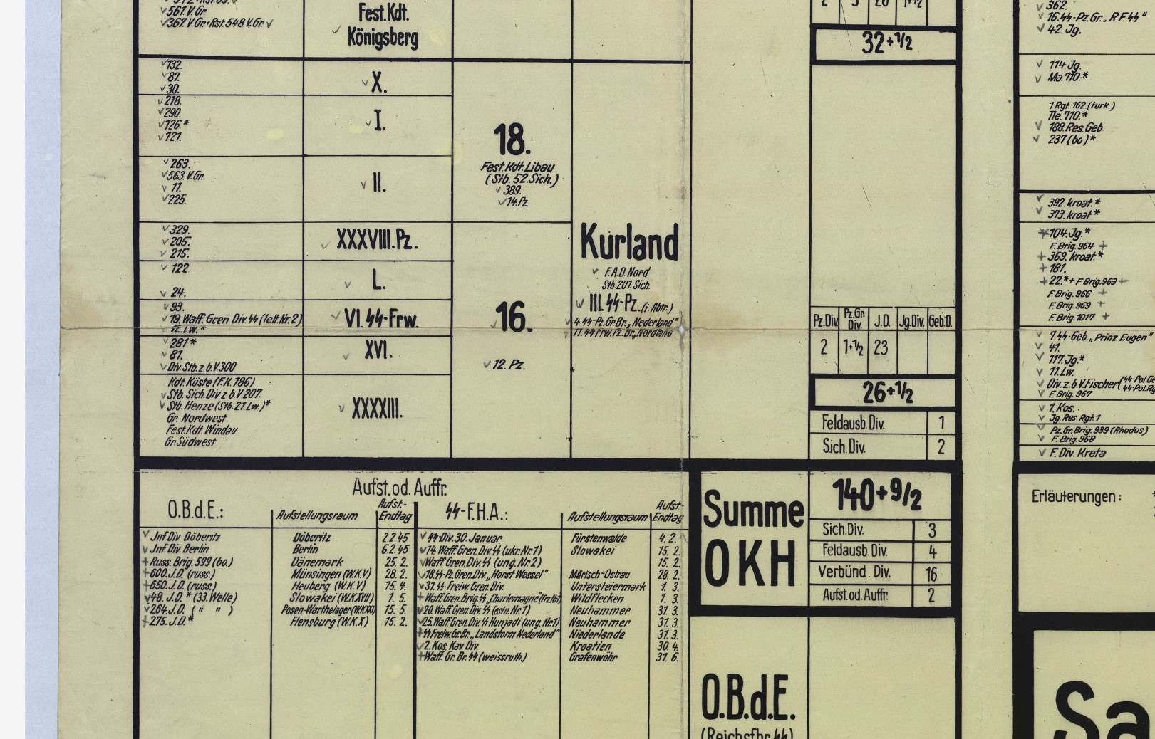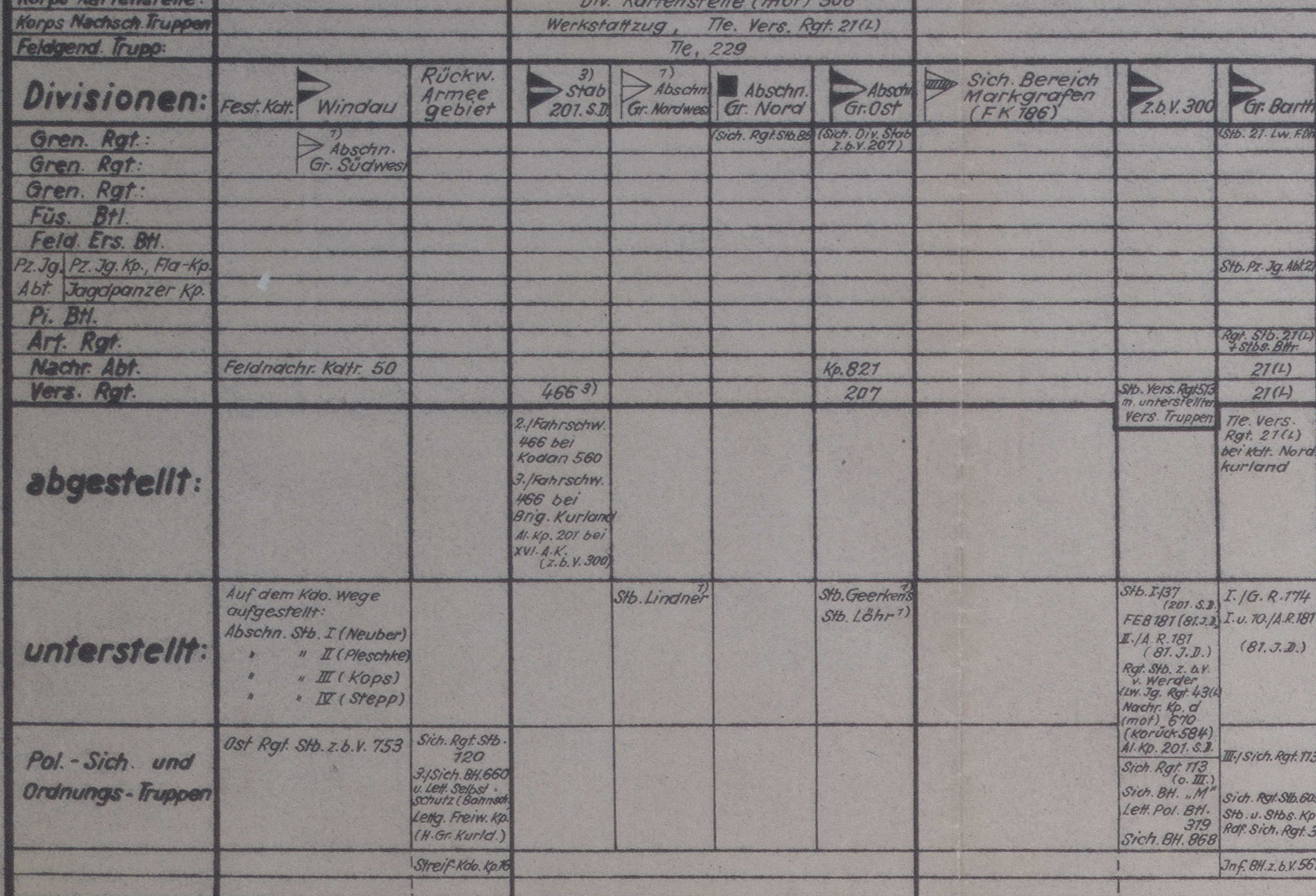 Ühesõnaga nagu ma allolevailt piltidelt välja loen siis diviis oli peale Eestist taganemist Wehrkreis I ümberformeerimisel ning saadeti veebruari alguses Kuramaale. Oman gliederunge kuni 31.03.45ni ja kuni selle ajani on diviis XVI korpuse nimekirjas. Milliseid üksuseid see eriotstarbeline diviis siis ikkagi kontrollis? Väljamaallaste käest ei tasu seda eriti küsida kuna Tessin (ja sealt edasi ka ülejäänud teosed) väidab et diviis kontrollis 2. 4. 5.(!) ja 6. piirikaitserügementi kuni sõja lõpuni.